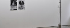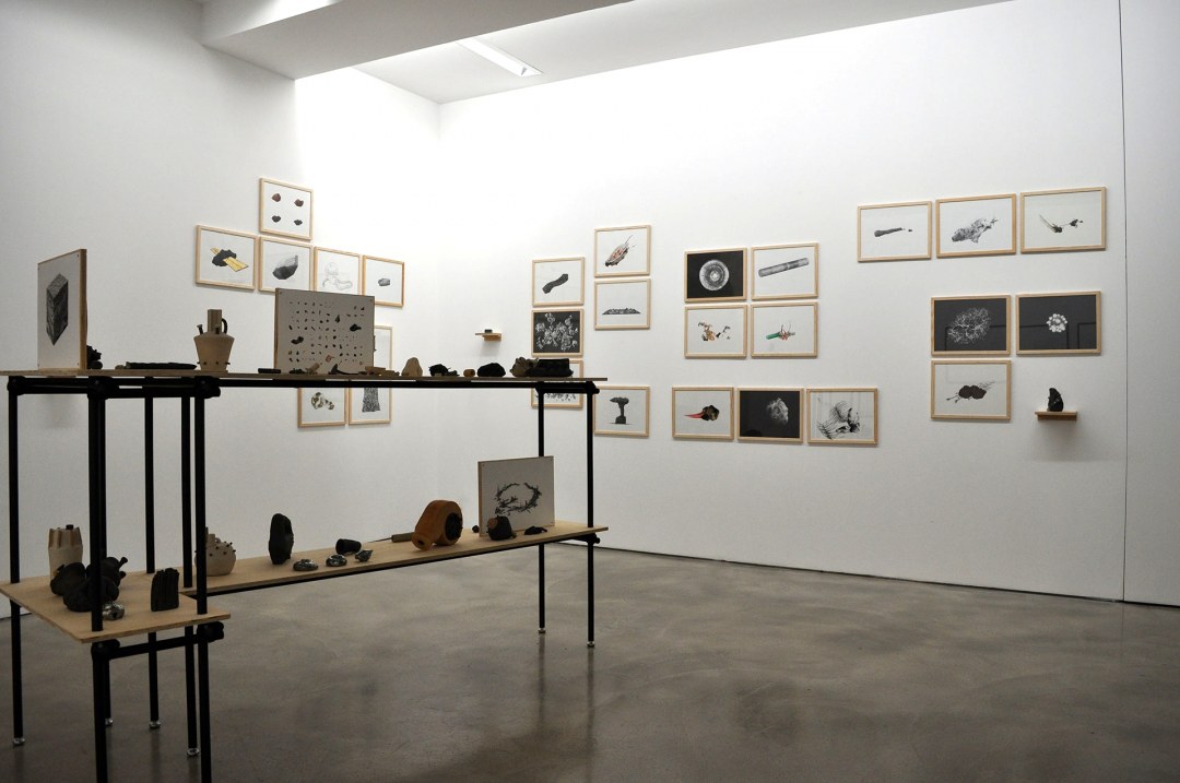 Je tiens à remercier la Galerie Éponyme de me permettre de poursuivre dans ses murs le travail entamé pour Alios! Cette carte blanche m’autorise à aller au-delà des pièces produites pour l’exposition HYPERMuralité et à accompagner certains artistes durant les mois qui viennent. Première proposition, Étrange Caillou de Nicolas Desverronnières en binôme avec Sylvain Le Corre, avec qui il partage le même intérêt pour l’étrangeté et l’observation du monde. Créer des vestiges, des objets surréels, enrichis d’une collaboration rejoignant leurs deux pratiques. Sylvain Le Corre, qui entrera bientôt en résidence au Domaine de Kerguéhennec, est un observateur minutieux qui ne cesse de fouiller le paysage en quête de sens. Nicolas quant à lui, développe un rapport plus fictionnel au quotidien, aux choses trouvées, banales et pourtant mystérieuses. Ils se retrouvent autour de l’idée réjouissante de l’archive, de la fouille “archéologique“, tentés qu’ils sont de créer une pseudoscience où le dessin et la céramique les rapprocheraient de véritables découvertes : vases, amphores… Sans parler du plaisir du matériau, de la terre qu’on manipule. Si vous prêtez l’oreille, peut-être entendrez-vous les stridences du satellite en vol stationnaire dans le ciel de La Teste que présente, sous le titre Carlingue, le jeune breton. Carlingue est en bois de cagette… Bienvenue sur la dune.